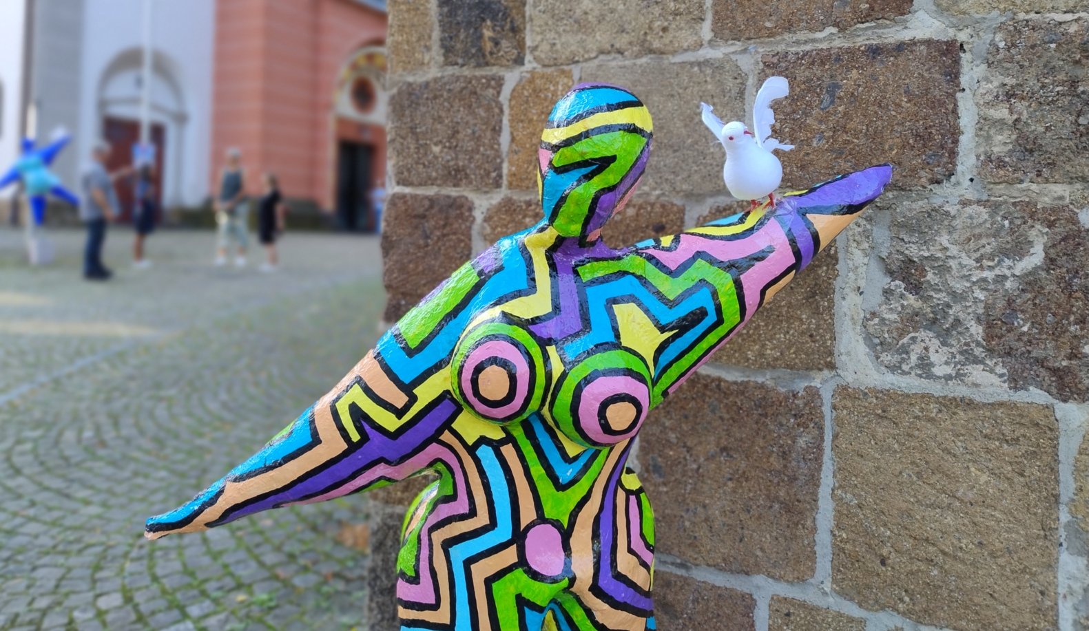 In integrativen Workshops entsatandene Friedens-Nanas säumten den Kirchplatz von St. Servatius. Die Skulpturen wurden von Maria Luise Streng (Bornheim) gemeinsam mit Frauen aus dem Iran, der Ukraine und Peru gefertigt.