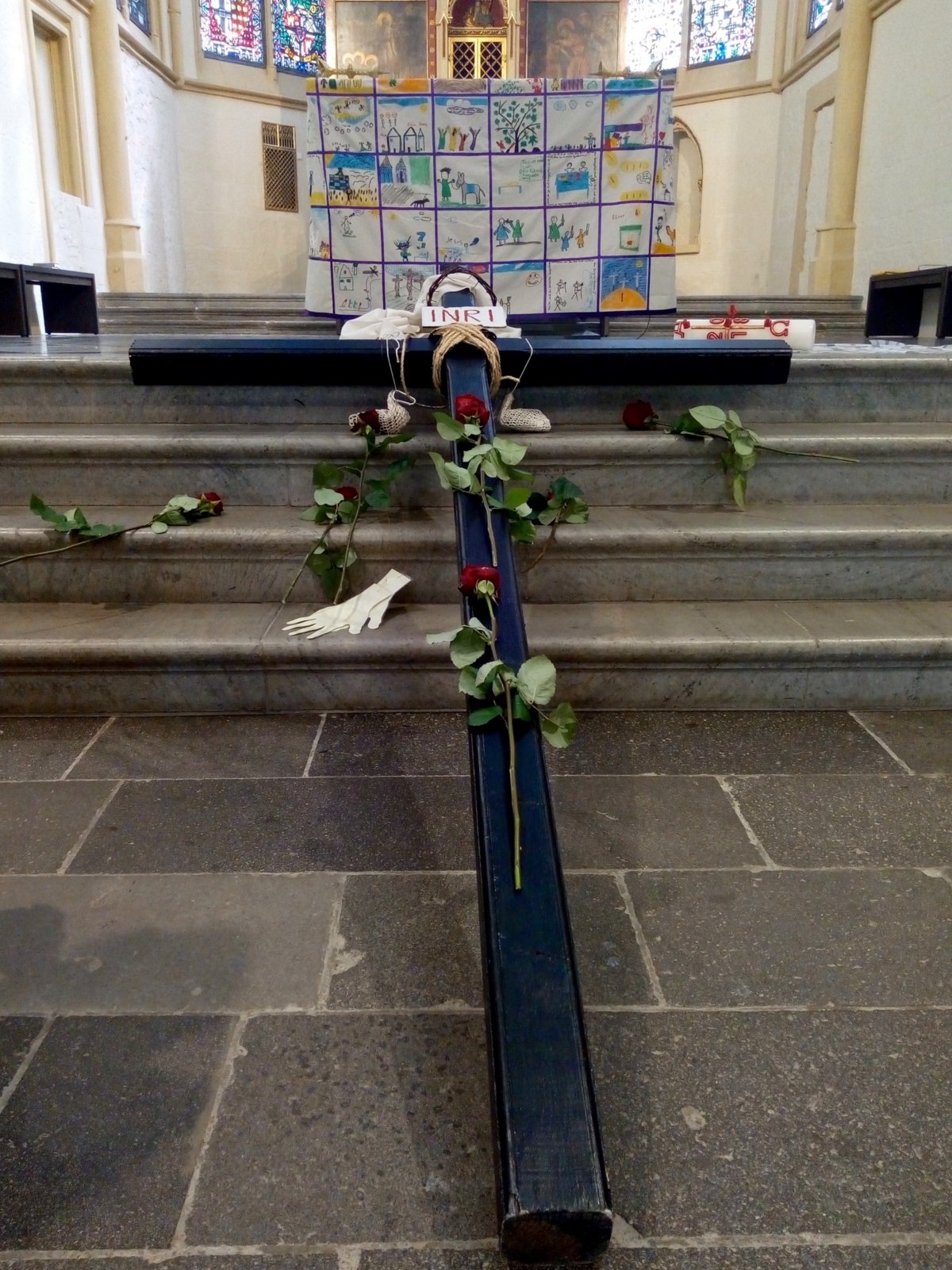 Alle traten nun einzeln nach vorne an das Kreuz - ein kurzer, ganz persönlicher Moment. Einige Kinder hatten Rosen, die sie ans Kreuz legten - Zeichen der Liebe Jesu.