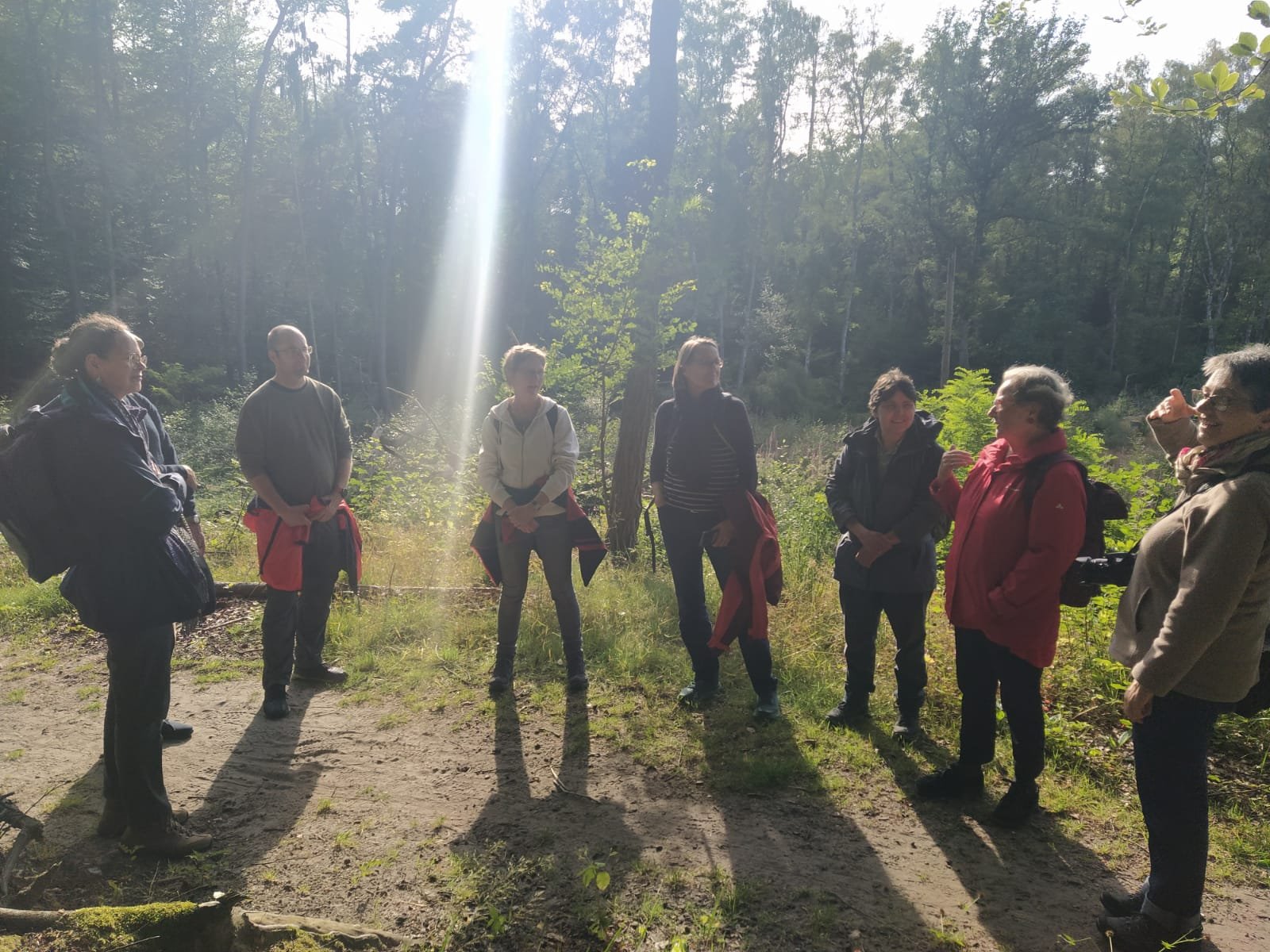 Sobald wir die laute, trubelige Stadt verlassen hatten und im Wald die Vögel zwitschern hörten, machten wir einen ersten Halt. Welchen Ballast tragen wir mit uns rum, persönlichen und kirchlichen? Wie erholen wir uns, finden unsere Balance? Wie gelingt Abgrenzung gegenüber den fremden und eigenen Erwartungshaltungen? Im regen Austausch zeigte sich, dass wir da doch sehr unterschiedlich sind. Dass es uns oft wie Jesus und den Jüngern geht, wir kommen gar nicht zur Ruhe, da vorher schon wieder Anforderungen/Menschen auf uns warten. Dass man auf der anderen Seite aber den Trubel und die Gemeinschaft mit anderen auch genießt.